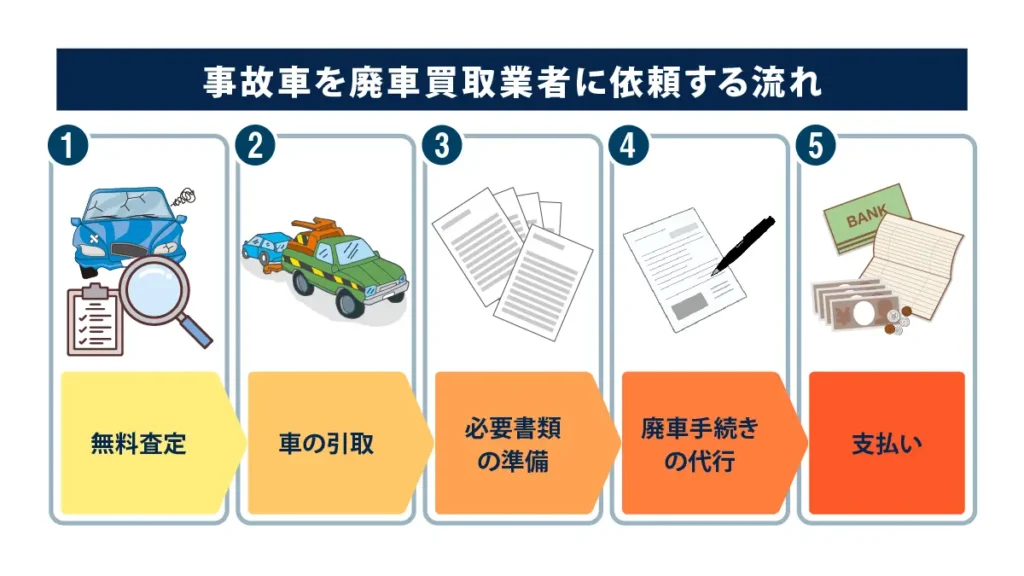 事故車の廃車を廃車買取業者に依頼する際の基本的な流れは、次の通りです。