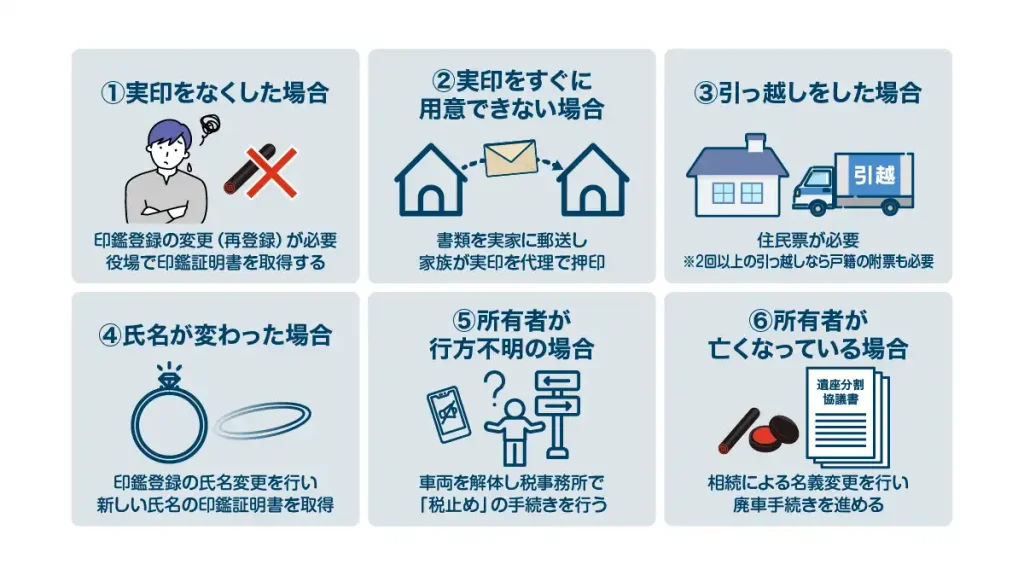 廃車手続きを進める際、実印の紛失や住所変更などの理由で、印鑑証明書をスムーズに用意できない場合があります。