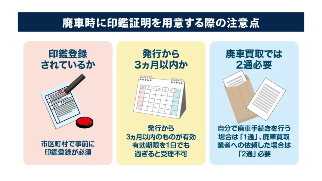 廃車手続きに向けて印鑑証明書を取得する際には、以下の注意点を押さえておきましょう。