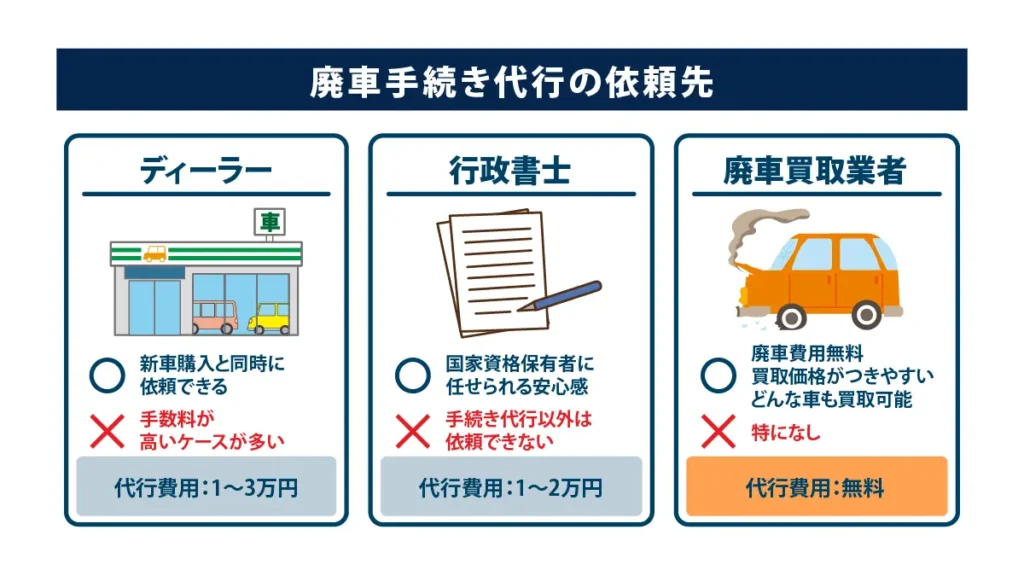 ディーラーは信頼性が高いものの手数料は1万〜3万円、行政書士は書類手続きのみで1万か〜2万円程度かかります。一方、廃車買取業者は手続き代行費用が無料で、引き取りから解体まで一括対応してくれるうえ買取金が受け取れる可能性もあるためおすすめです。