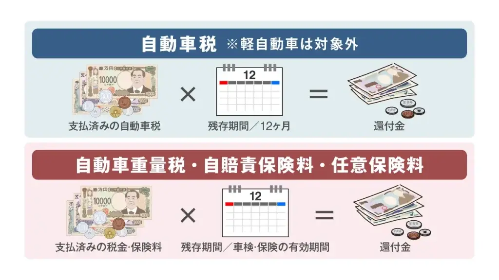 廃車を行う際は、自動車税・自賠責保険料・重量税などの還付金を受け取れる場合があります。これらは前払い制のため、廃車のタイミングによっては未使用分が返金されます。